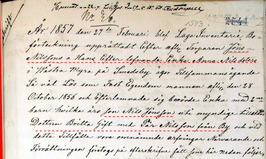 Ingressen till Jöns Nilssons och änkan Anna Nilsdotters gemensamma Boförteckning: Barnen Brita och Jöns omnämndes |