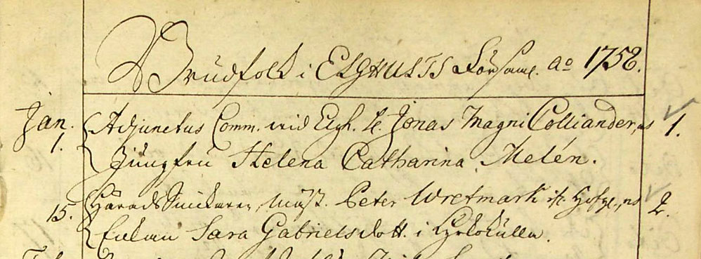Häradsnickaren Peter Wretmark och Sara Gabrielsdotter vigdes 15/1 1758 |