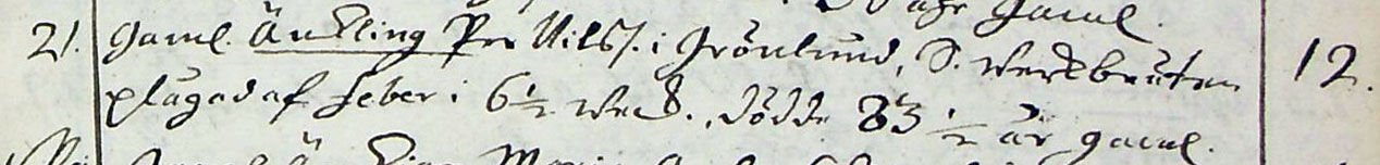 Den 21/4 1756 så dog "gaml.änkling Per Nilss. i Grönlund, S. werkbruten och plågad av feber i 6½ w.,dödde 83 ½ år gaml." |