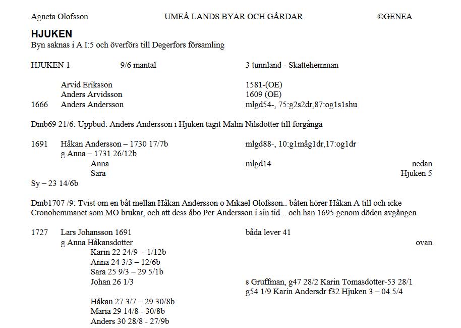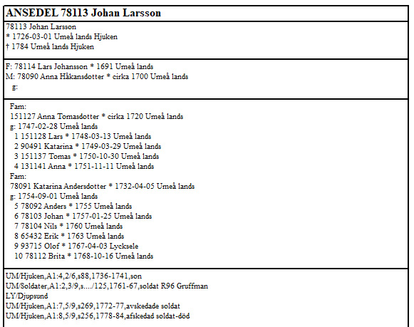 Lars Johanssons son Johan omnämns i släktutredning som finns i "UMEÅ LANDSFÖRSAMLING BYAR OCH GÅRDAR 1600 – ca 1760" av Agneta Olofsson sid 309 |