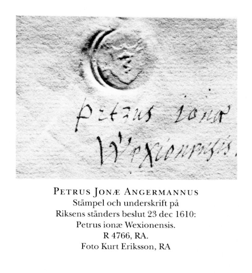 Mag. Petrus Jonæ Angermannus. Född i Arnäs socken och Lundeberga by 1559. Studerade i Gefle, reste utrikes och blef Magister i Jena. Huru han kommit till detta stift finnes icke, men 1591 har han blifwit Rector Scholæ i Arboga och redan twå år derefter befordrad till pastoratet. D. 3 Juli 1593 inventerades till honom ifrån Herr Pehrs arfwingar. S. år bewistade han det namnkunniga Upsala möte, hade det förtroendet att då wara Adsessor och Notarius och undertecknade beslutet. Följande år war han ock på stiftets wägnar i Upsala, då han 19 Febr. underskref ständernas obligation och försäkring, warande under allt detta ContractsProst. På riksdagen i Söderköping 1595 blef han wald och förordnad till Biskop i Wexiö, dit han ock snart afflyttade. Kallades ock 1609 till Biskopsembetet i Skara, men undanbad sig transporten. Bewistade hwarje gudstjenst i domkyrkan, hwarefter han förhörde barnen och legofolket hwad de lärt i kyrkan, förrän de fingo gå till middagsbordet. Jemte catechesen lärde han sina "pigobarn" (döttrar) Söndagsevangeliernas hufwudspråk. Visiterade träget i stiftet, då han förhörde presterne i Luthers större och folket i mindre catechesen. War på sin tid mycket wärderad såsom skald. Medlem af Bibelcommiteen "såsom mäktig i latin." Då han såsom mycket sjuk ansågs nära sin dödsstund, efterskickade han både borgare och prester, lät Domprosten gifwa sig nattwarden, räknade derwid upp alla concordiebokens beståndsdelar, försäkrande sig efter dessa hafwa lefwat och efter dessa wilja dö, tog så sjelf upp och sjöng med segerfröjd sitt tacksägelse för lifwet och all Guds nåd derunder. Han dog dock först en tid derefter 11 Sept. 1630.