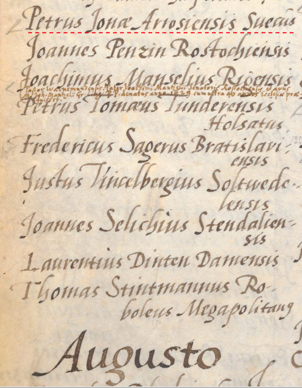 Från Inskrivningsboken till Rostocks universitet: för juli 1587: Petrus Jonea Arrosiensis Suecus, dvs från Västerås |
