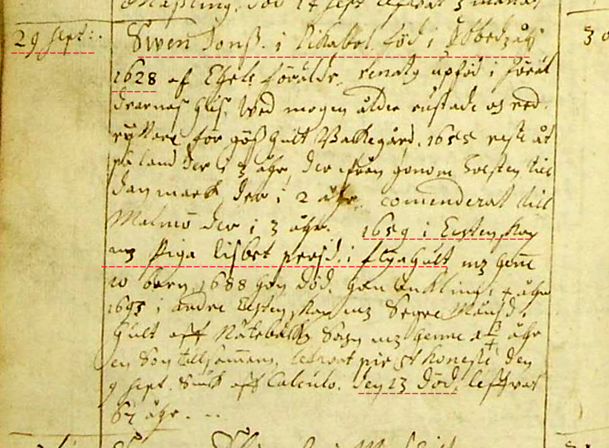 Ur Dödboken 1695: Sven Jonsson dog 13/9 1695 och begravdes 29/9 1695 |