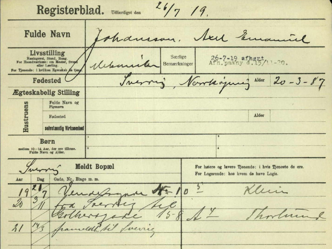 Axel bodde i Köpenhamn 1919-21 en polisens registerblad |