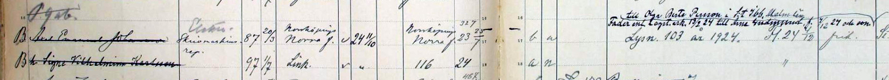 Född 1835-06-26 i Norrköping S:t Olai (E) 33 . Död 1926-02-19 i Norrköpings Östra Eneby (E) 34 . |