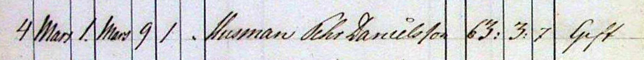 Född 1802-11-23 i nr.6, S:t IBB (M) 1 . Död 1866-03-01 i nr.3, S:t IBB (M) 2 . Husman, torpare |
