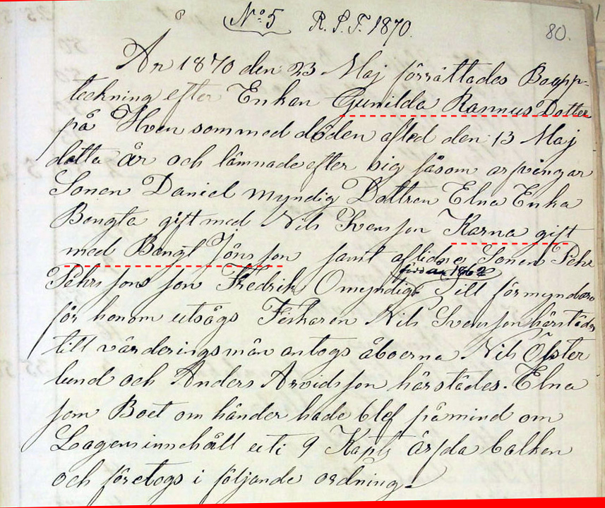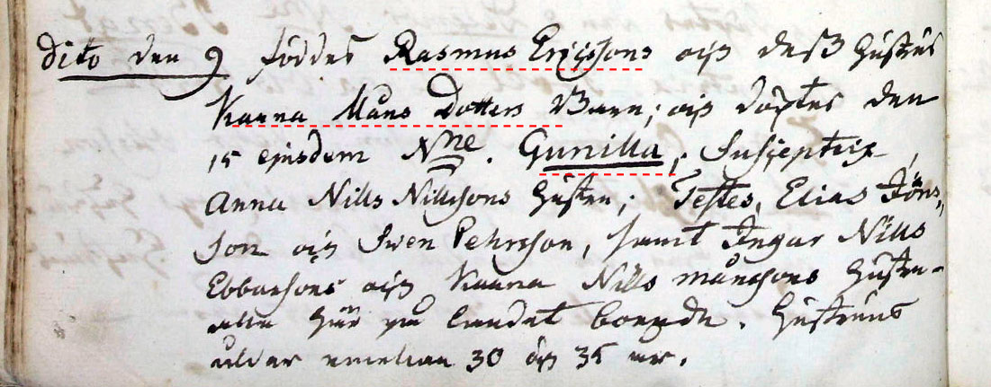Ur ingressen till Bouppteckningen efter Gunilla Rasmusdotter där bl.a. dottern Karna omnämndes |