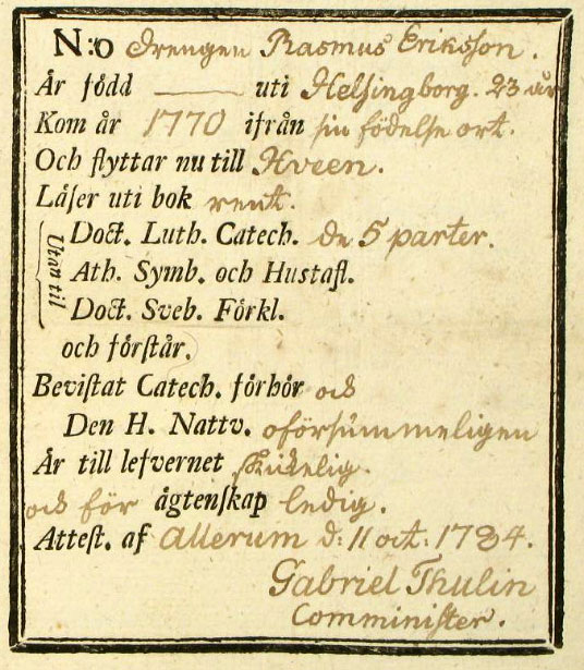 Rasmus flyttningar efter föräldrarnas död:- 1770 flyttade han från Helsingborg till Allerum