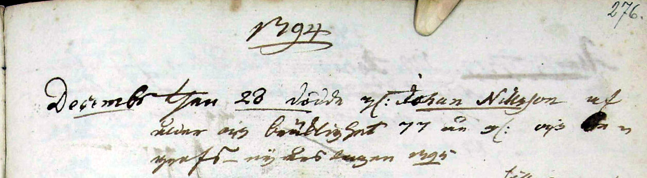Johan Nilsson dog 28/12 1794, 77 år gammal "af ålder och bräcklighet". Han dog 17 dagar efter sin hustru |