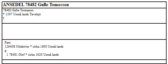 Gulle Tomasson i släktutredningen för Vännfors som finns i ” UMEÅ LANDSFÖRSAMLING BYAR OCH GÅRDAR 1600 – ca 1760” av Agneta Olofsson sid 280 |