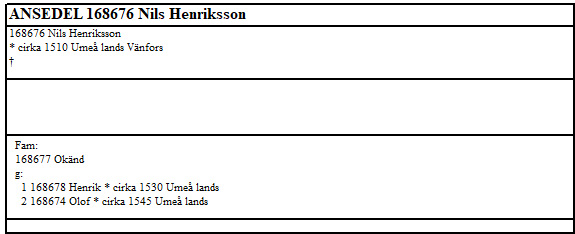 Nils Henriksson står först i släktutredning för Vännfors som finns i ” UMEÅ LANDSFÖRSAMLING BYAR OCH GÅRDAR 1600 – ca 1760” av Agneta Olofsson sid 280 |
