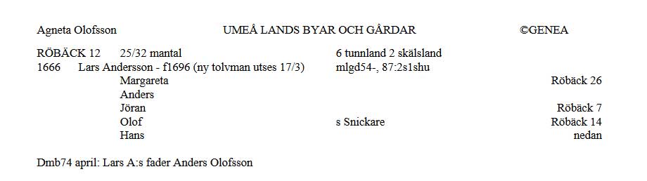Lars Andersson omnämns i släktutredning för Rödbäck som finns i ” UMEÅ LANDSFÖRSAMLING BYAR OCH GÅRDAR 1600 – ca 1760” av Agneta Olofsson sid 148