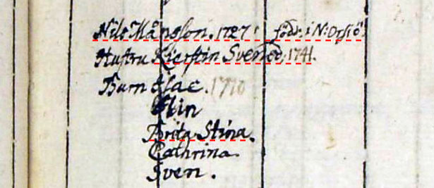 Ur Husförhörslängden (1755-88) från Holmen. Här stod hela familjen med och att Kierstin var född 1741 |