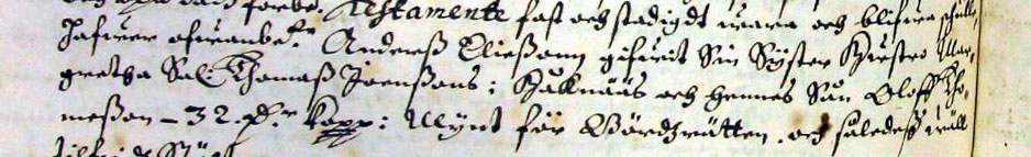 DBN1649,17/2,§10:Vart och avdömt att en ung person, Johan Johansson i Håknäs skall bekomma testaments brev oppå både löse och faste egendom i Järnäs som Anders Eliasson ibm. med sin hustro Märit Pädhärsdotter honom testamenterat haver, för det han dem intill deras döde dag väl skiöta och förestå skall / eftersom de barnlöst folk äre / och sedan Christeligen begrava låta. Och är benämnde Johan Johansson föreskrivne Ander Eliassons hustrus frände. Eljest och oppå det förbenämnde Testamente fast och stadigt vara och bliva skulle, haver ovanbenämnde Anders Eliasson givit sin syster, hustru Margareta, salig Tomas Jonssons i Håknäs och hennes son Olof Tomasson, -- 32 daler kmt. för Bördsrätt och således väl tillfrids stälde.