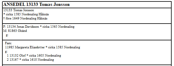 Ur Domboken 17/2 1649: "....Anders Eliasson gifvit sin syster, hustru Margaretha, Sal: Thomas Jonssons i Håknääs och hennes sån Olof Thomasson, -- "