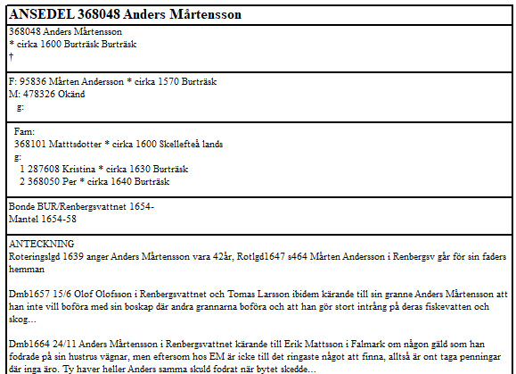 Anders Mårtensson var son till Mårten Andersson och gift med en Mattsdotter från Falmark enligt "Burträsk 1539-1800" av Agneta Olofsson sid 265 |