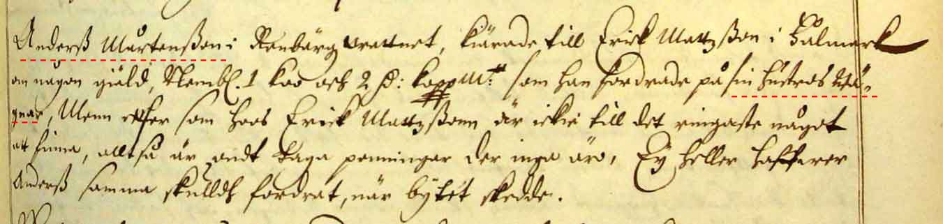 "Anders Mårtensson i Renbergsvattnet kärande till Erik Mattsson i Falmark om någon gäld ....som han fodrade på sin hustrus vägnar, Men eftersom hos Erik Mattsson är icke till det ringaste något att finna, alltså är ondt taga penningar där inga äro. Ej heller hafver Anders samma skuldt fordrat när bytet skedde."