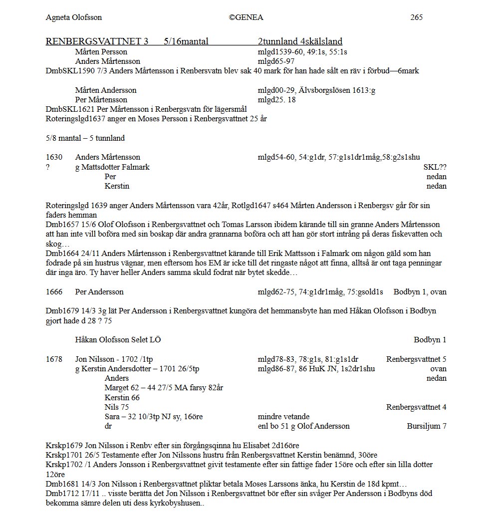 Från Falmark var en Mattsdotter gift med Anders Mårtensson i Renbergsvattnet enligt "Burträsk 1539-1800" av Agneta Olofsson sid 265 |