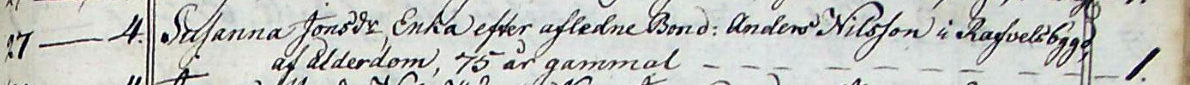 Susanna Jonsdotter dog av ålderdom 27/11 1791, 75 år gammal |