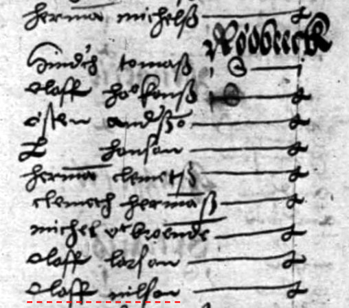 Från 1543 års Landskapshandlingar över Rödbeck: sist på utdraget står det "Oloff Nilsson" |