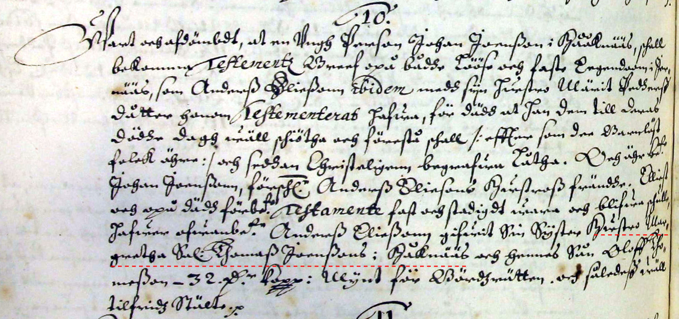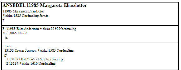 --------------------------------------------Släktskapen utreds i Dombok 17/2 1649 § 10: "§ 10.Vart och avdömt att en ung person, Johan Johansson i Håknäs skall bekomma testaments brev oppå både löse och faste egendom i Järnäs som Anders Eliasson ibm. med sin hustro Märta Persdtr ( Märit Pädhärsdtr ) honom testamenterat haver, för det han dem intill deras döde dag väl skiöta och förestå skall / eftersom de barnlöst folk äre / och sedan Christeligen begrava låta. Och är benämnde Johan Johansson föreskrivne Ander Eliassons hustrus frände. Eljest och oppå det förbenämnde Testamente fast och stadigt vara och bliva skulle, haver ovanbenämnde Anders Eliasson givit sin syster, hustru Margareta, sal. Tomas Jonssons i Håknäs och hennes son Olof Tomasson, -- 32 dr. kmt. för Bördsrätt och således väl tillfrids stälde. "