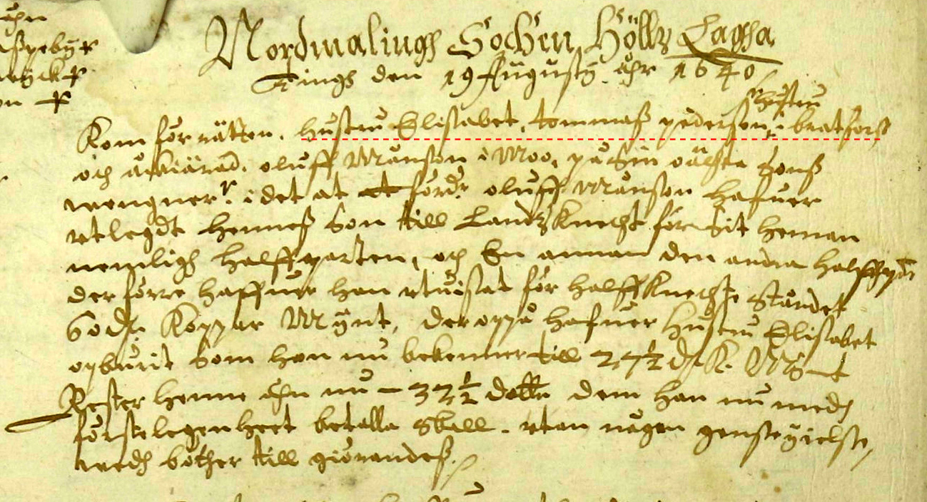 DBN1640,19/8,§1:Kom för rätten Hustru Elisabeth, Tomas Perssons hustru i Brattfors och åkärade Olov Månsson i Mo på sin oäkta sons vägnar, benämnt Pedär Christopphärsson i det att förbemälte Olov Månsson haver utlejt hennes son till lands knekt för sitt hemman, nämligen halvparten, och en annan andra halvparten, därföre haver han utvisats för halvknekte ståndet 60 daler koppar mynt, däruppå haver hu. Elisabeth uppburet, som hon nu bekänner 27 1/2 daler kmt. Rester henne ännu - 32 1/2 mark kmt. dem hon nu med första lägenhet betala skall utan någon gensägelse med böter till görandess.