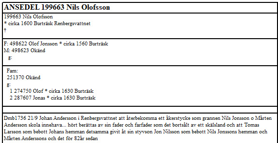Ur släktutredningen "BURTRÄSK Byar och gårdar 1539-1800" av Agneta Olofsson sid 270 för Renbergsvattnet Här finns Olof Jonsson, sonen Nils Olofsson samt sonsonen Jon uppräknade