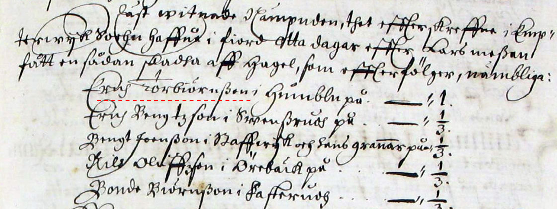 Från Domboken VT 1651 så intygas att bl.a. Erik Torbjörnsson i Humblan fått skador av hagel |