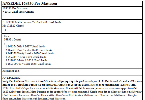 Per Mattson står först i släktutredningen från "UMEÅ LANDSFÖRSAMLING BYAR OCH GÅRDAR 1600 ca 1760" sid 305 |