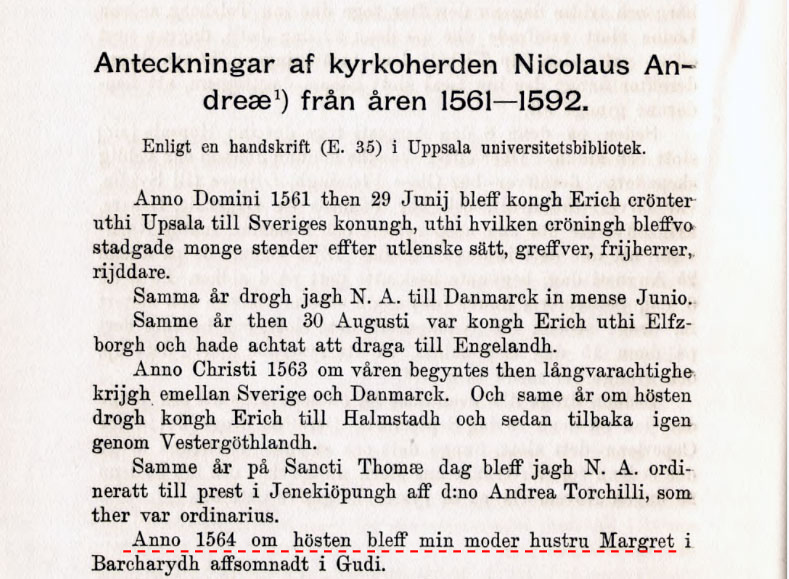 Ur "Historiska handlingar" (Del 20), sid 216 där sonen Nicolaus Andrae skrev att modern Margret dog hösten 1564 |